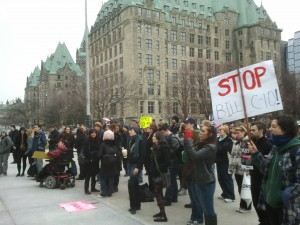 Anti Crime Bill (C10) protesters in front of Canada's Supreme Court with the West Wing of Parliament in the back in Ottawa SAT 26NOV2011